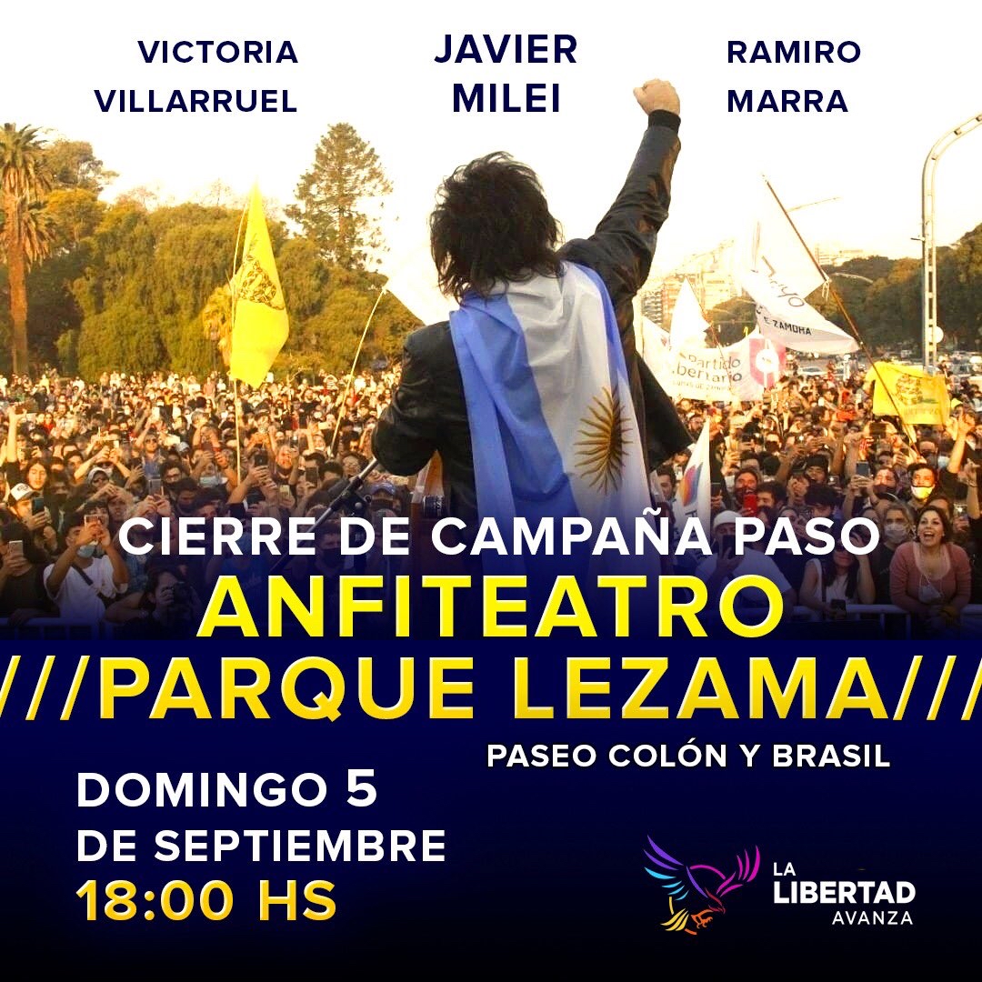 El economista y candidato al parlamento argentino Javier Milei anunció en sus redes sociales el lanzamiento oficial de su campaña la cual tendrá lugar el próximo sabado 7 de agosto a las 1600 hora local en la plaza Holanda el mismo lugar en donde anunció su intención de meterse en la política hace varios meses. Javier Milei - Presidente 2023. Un medio de propaganda oficial como lo es C5N me estuvo escrachando acusándome de planero y diciendo que.